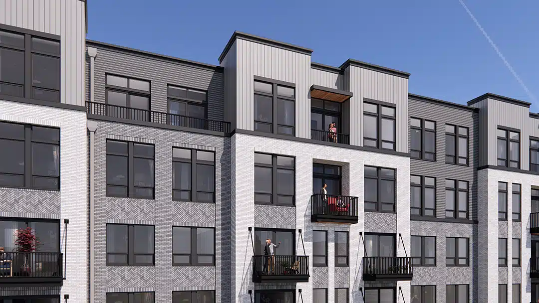 The architectural design and material palette, accentuated by mottled shades of warm, grey-toned brick, is quiet and sophisticated. Simple and subtle detailing is meant to support a clean modern-leaning aesthetic that should position this project to appeal to an upscale demographic.