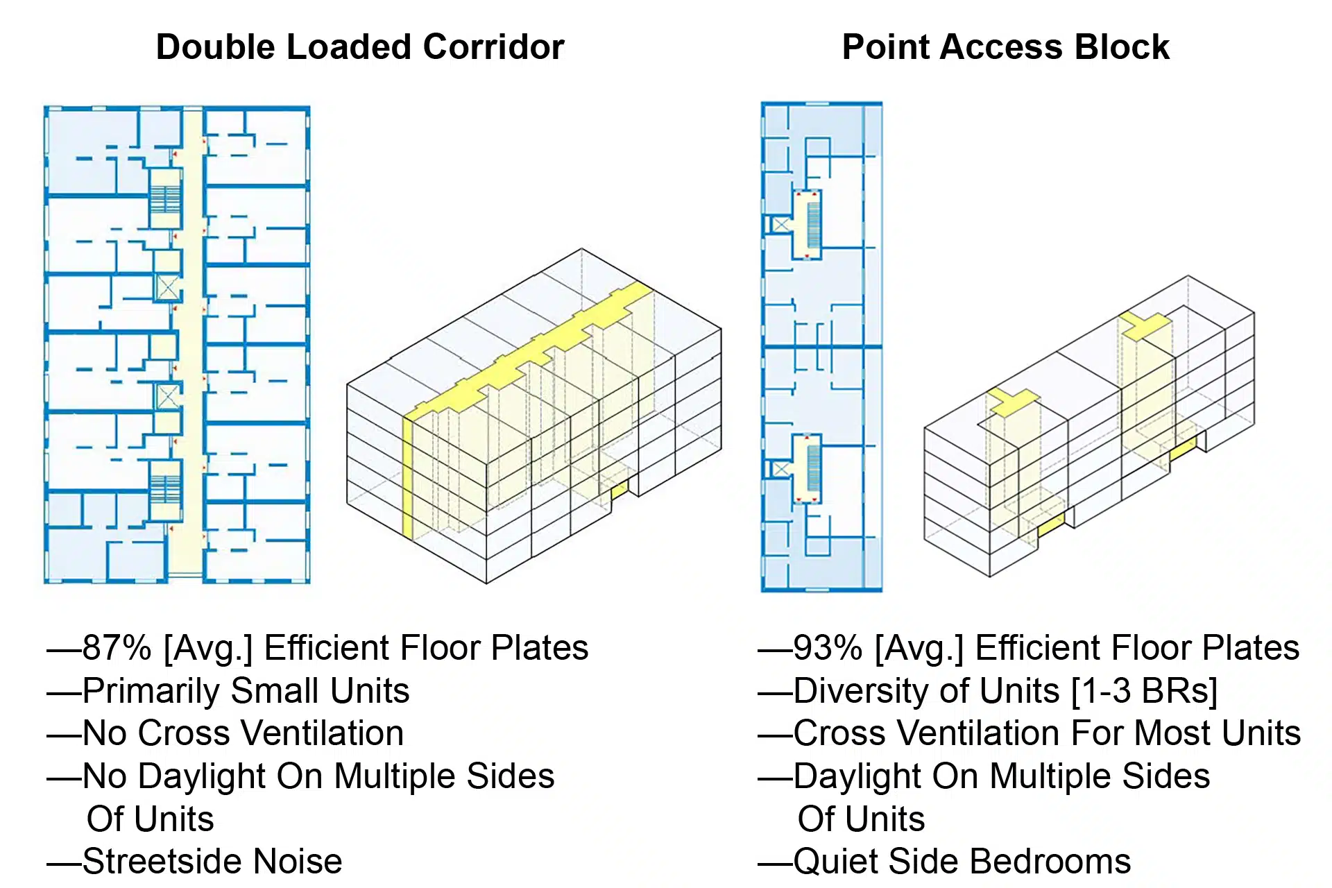 In the most basic terms, this is a discussion of dueling multifamily housing types: the North American ‘double loaded corridor’ type and the single-stair, ‘point access block’ type utilized across the globe—from South America to Europe and the UK, and across the whole of Asia.