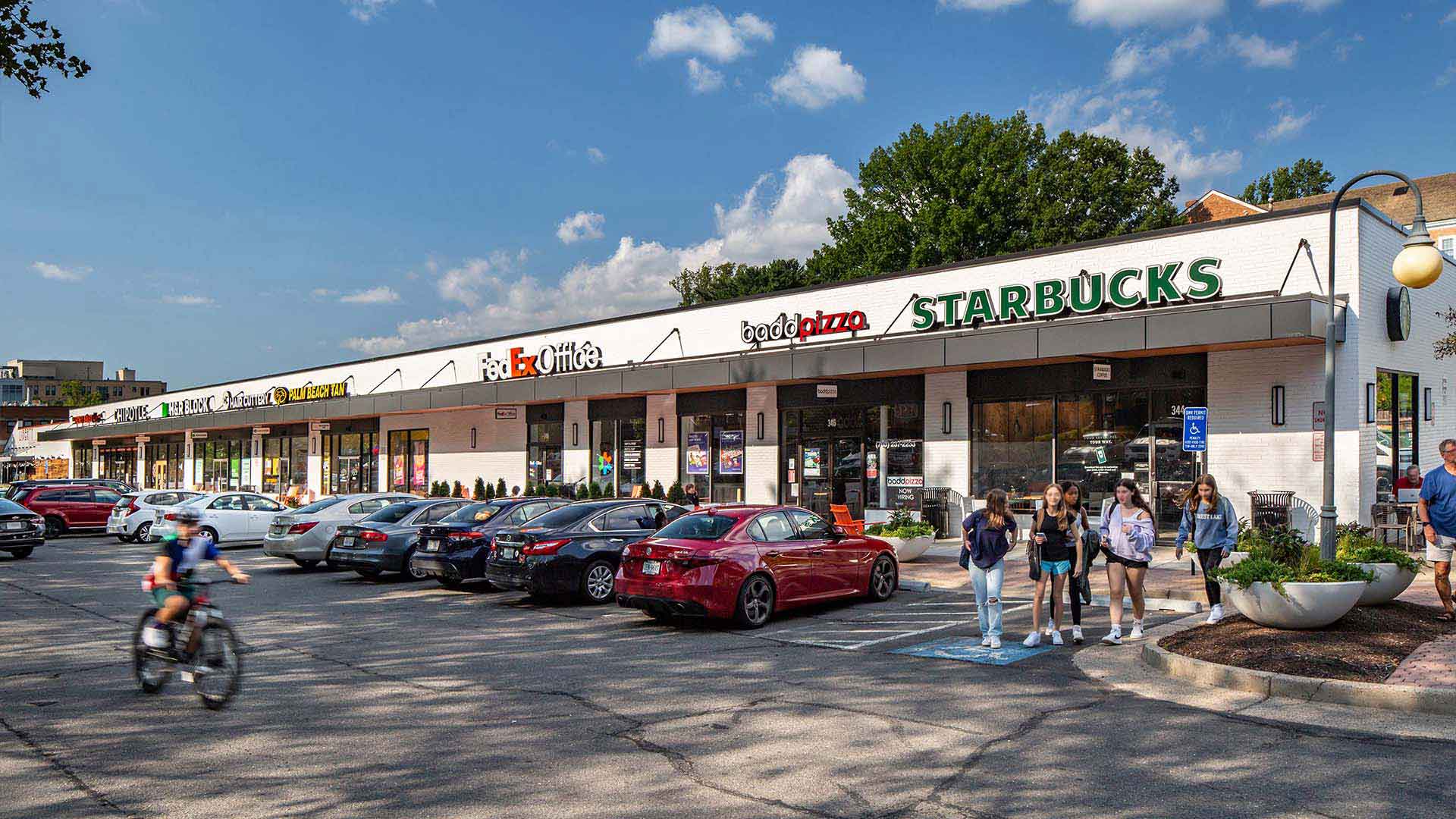 Fortunately, the existing building structure was more than adequate to support a robust new canopy. Likewise, the original brick was in great condition and easily refreshed with quality paint job. With removal of the colonnettes, the wider sidewalk afforded additional space for MV+A designed site furnishings, making for a more vibrant pedestrian experience and bolstering the appeal of Broaddale Village as a retail destination